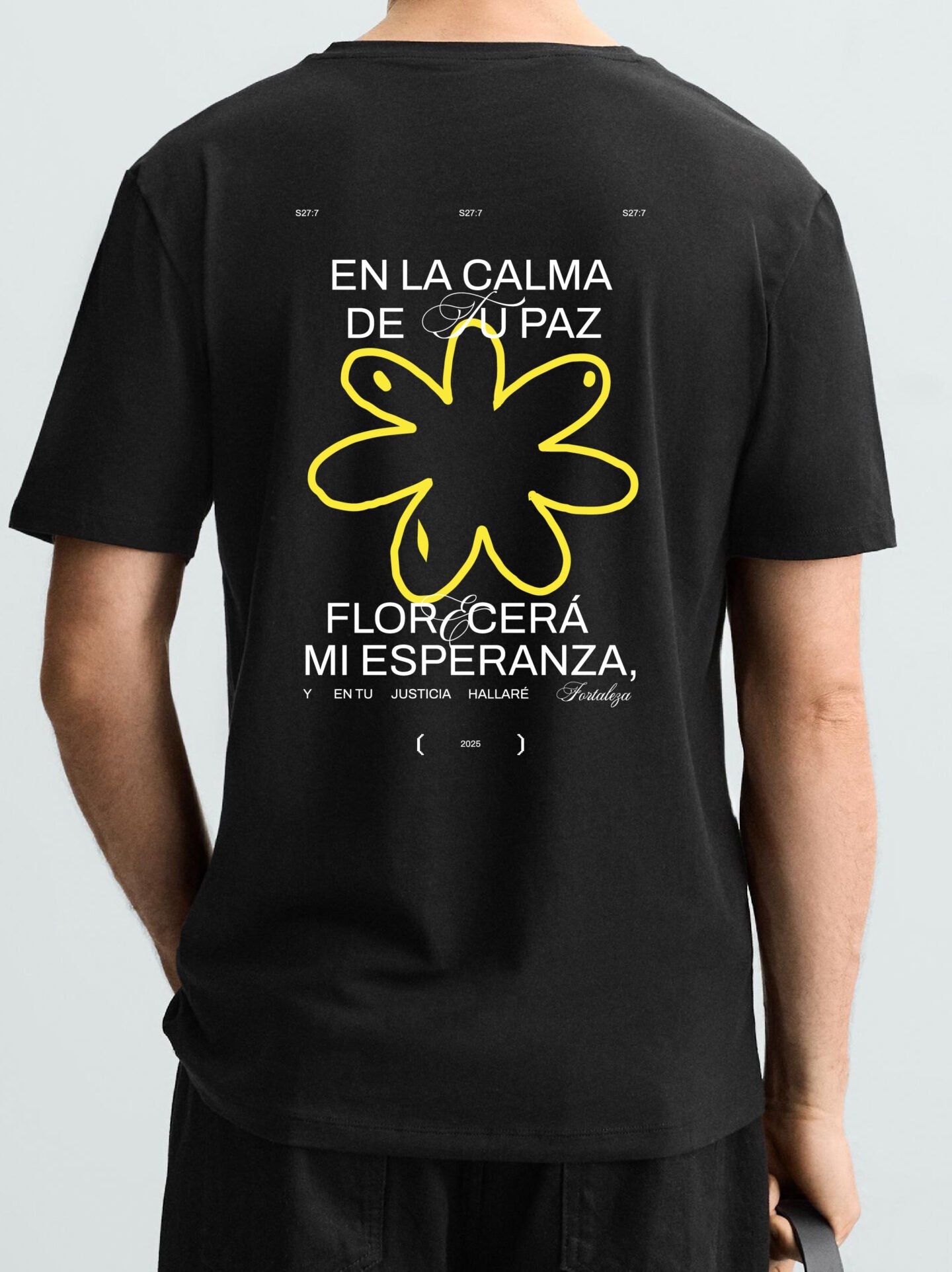 Inspirada en paz, esperanza y fortaleza. Ilustración floral en amarillo que contrasta con el diseño tipográfico. Perfecta para quienes buscan estilo con mensaje. Hecha en algodón grueso y suave al tacto.